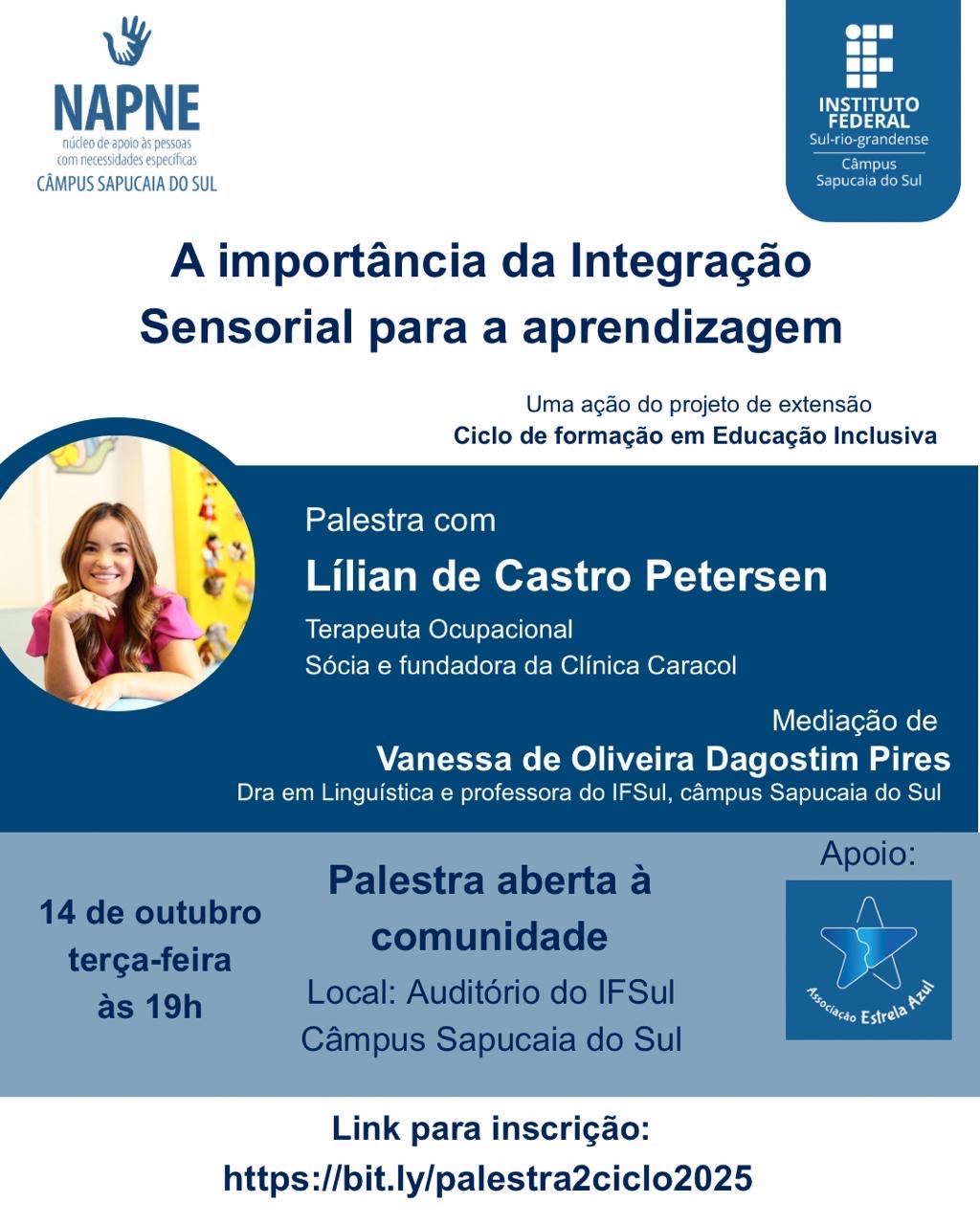 A atividade tem o apoio da Associação Estrela Azul e integra o Ciclo de Formação Inclusiva 2025, promovido pelo NAPNE – Núcleo de Apoio a Pessoas com Necessidades Específicas do IFSul Câmpus Sapucaia do Sul.