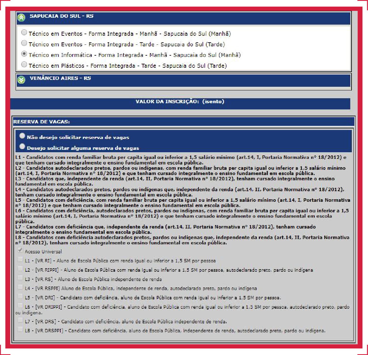 Se você optou pela reserva de vagas, vai ter, então, que escolher a modalidade em que você se enquadra. Cada modalidade é indicada pela letra L acompanhada por um número (L1, L2, L3, L4, L5, L6, L7 e L8). Na sua tela (de inscrição) vai aparecer esta imagem abaixo, explicando cada uma delas (aqui, para ilustrar, pegamos como exemplo o curso técnico em informática do câmpus Sapucaia do Sul).