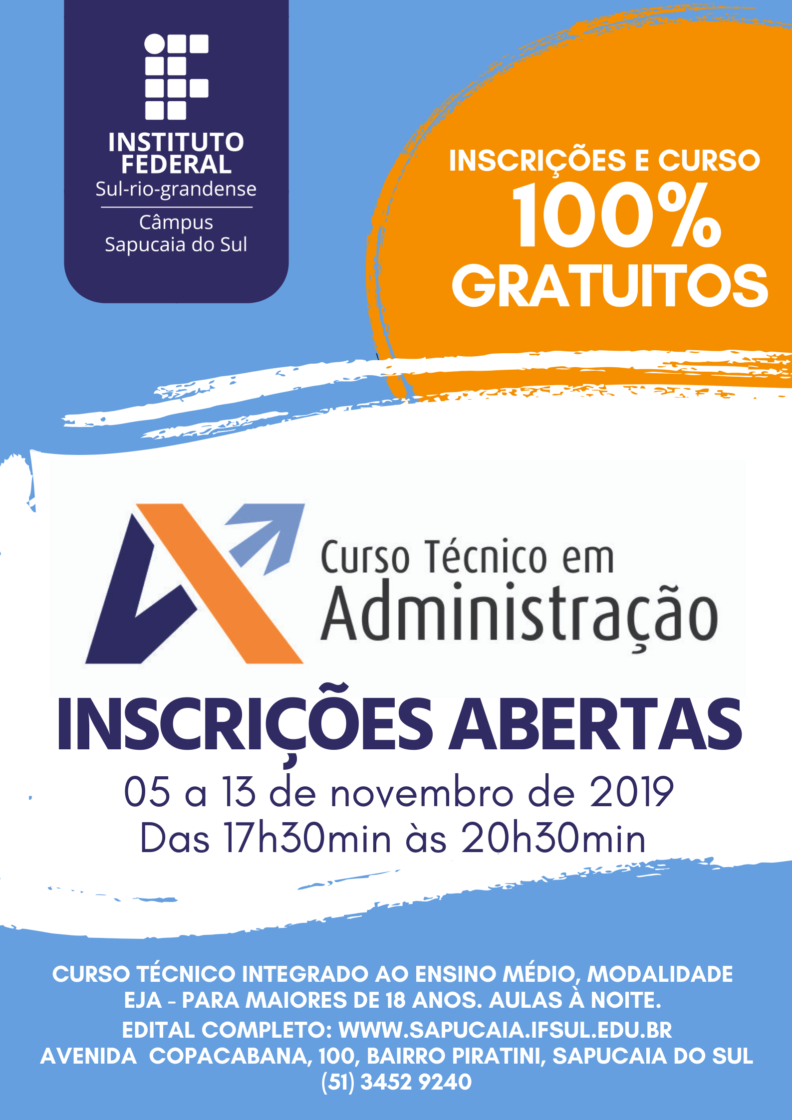 Estão abertas entre os dias de 05 e 13 de novembro de 2019 as inscrições gratuitas para o curso técnico de nível médio em Administração do Câmpus Sapucaia do Sul do IFSul. O curso é ofertado na modalidade de Educação de Jovens e Adultos (EJA). Para ingressar é preciso ter ensino fundamental completo e mais de 18 anos, na data da matrícula.