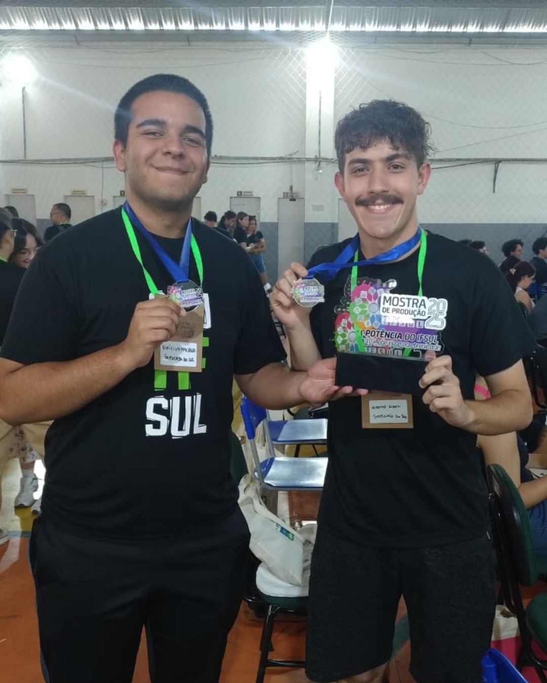 Na seção 11ª Mostra de Extensão do IFSul, espaço para divulgação de projetos de extensão desenvolvidos nos câmpus, os estudantes Yasmin Teixeira Wiedenhoft e Vicente Carioli Ferreira apresentaram o projeto IFOMAT, com orientação do professor Marcelio Adriano Diogo. A participação rendeu aos estudantes a premiação de 3º lugar na Mostra.