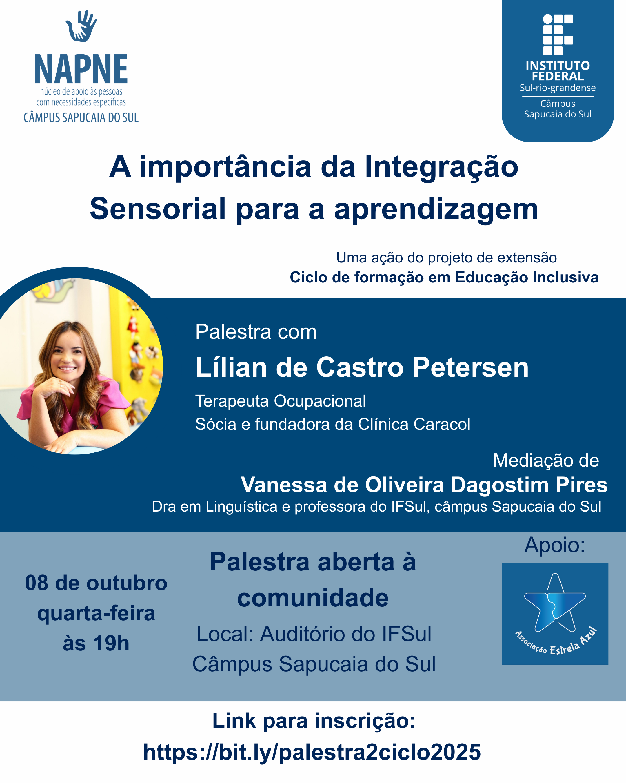 A palestra “A importância da integração sensorial para a aprendizagem” será ministrada pela terapeuta ocupacional, sócia e fundadora da Clínica Caracol, Lílian de Castro S. Petersen, e contará com a mediação da professora Vanessa de Oliveira Dagostim Pires, doutora em Linguística e docente do IFSul Câmpus Sapucaia do Sul.